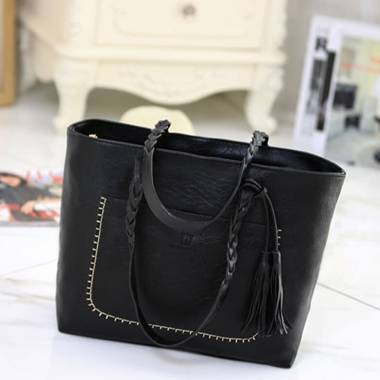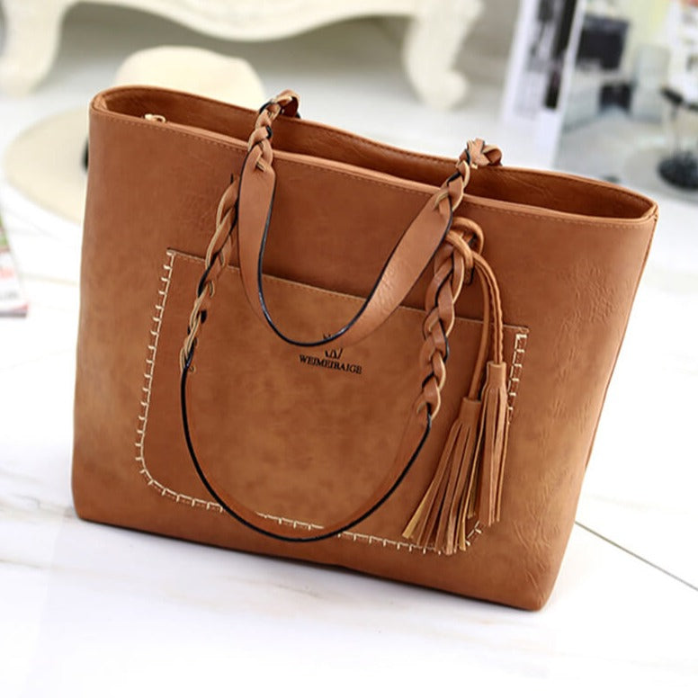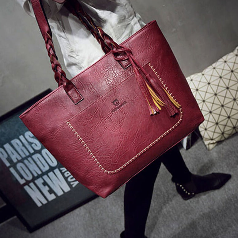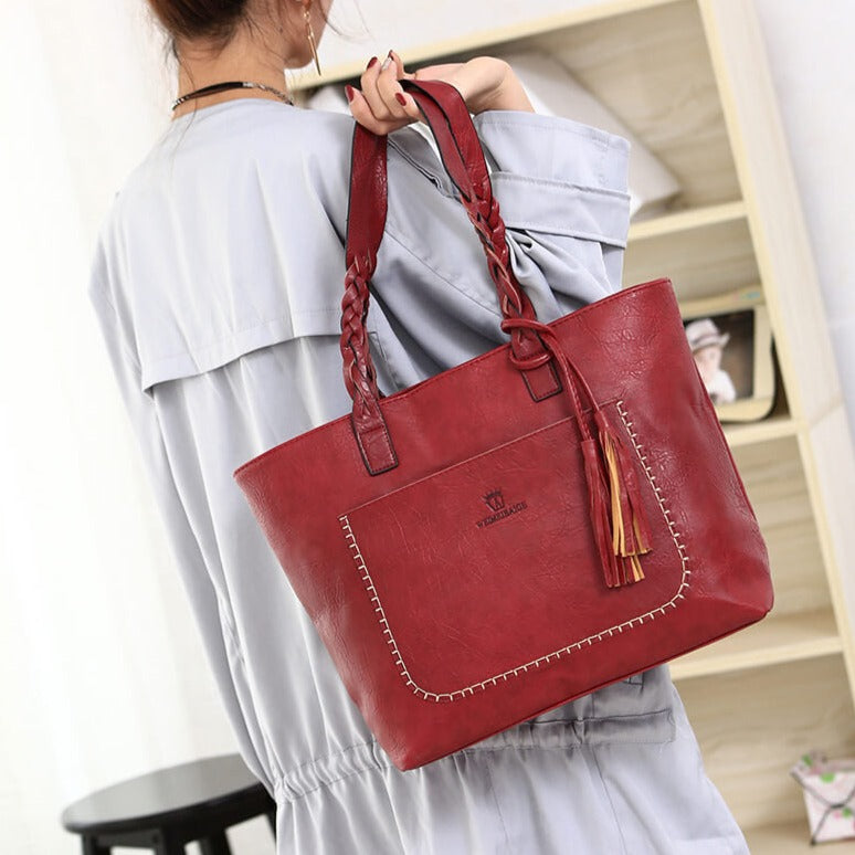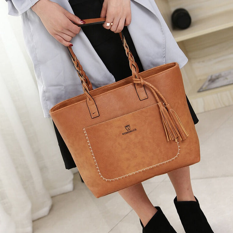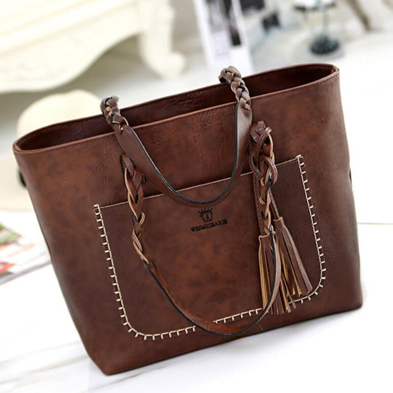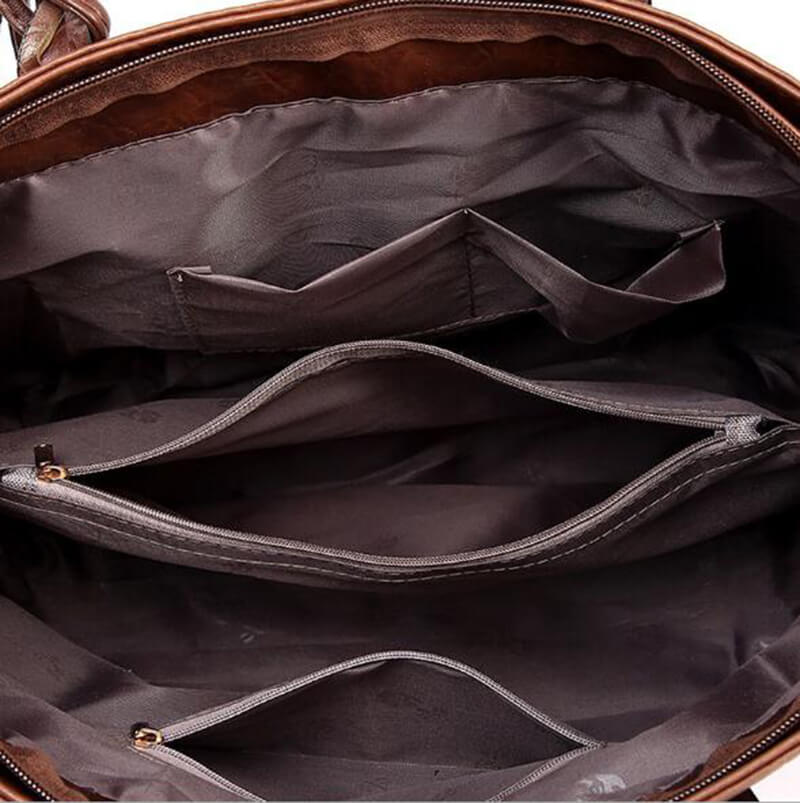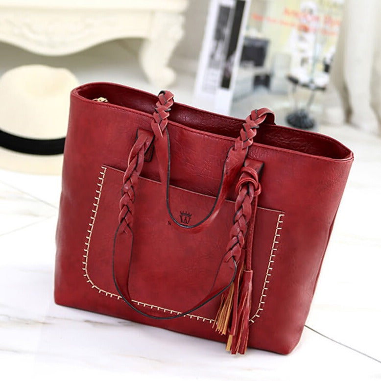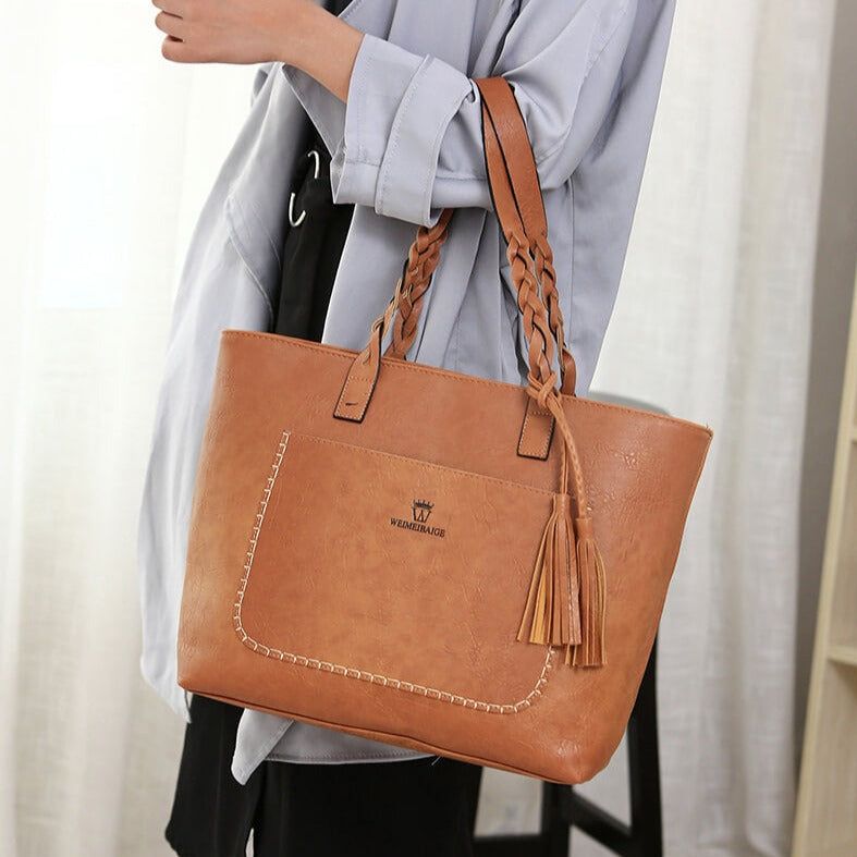 GERÄUMIG: Sie hat eine Innentasche mit Schlitz und eine Tasche mit Reißverschluss. Außerdem gibt es ein Außenfach mit Schlitz für zusätzlichen Platz. Die zwei geflochtenen PU-Lederriemen machen diese Tasche einzigartig.